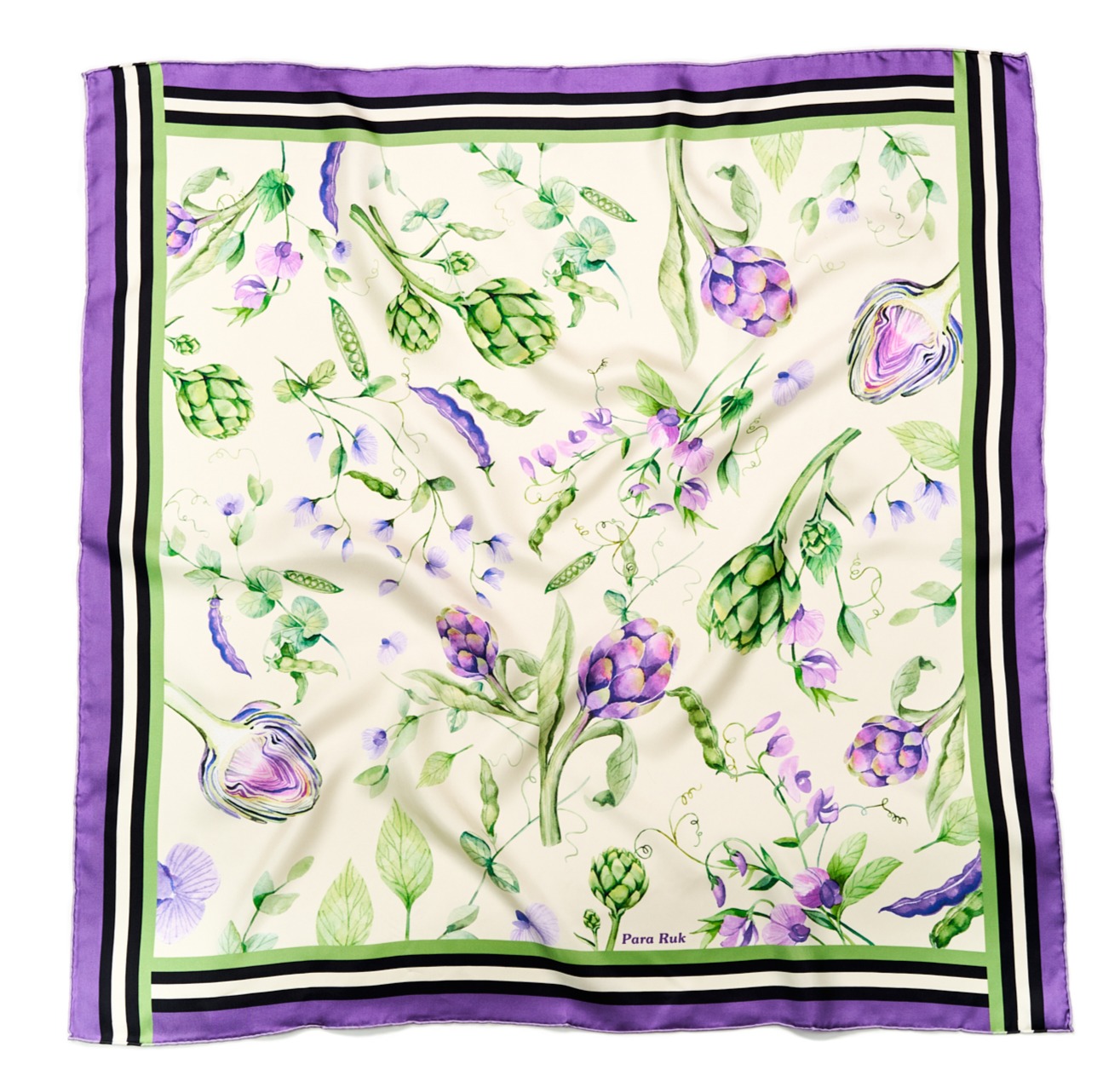 Vegetable print scarf, eco-friendly gift “Artichoke and peas” designers print, silk square scarf.